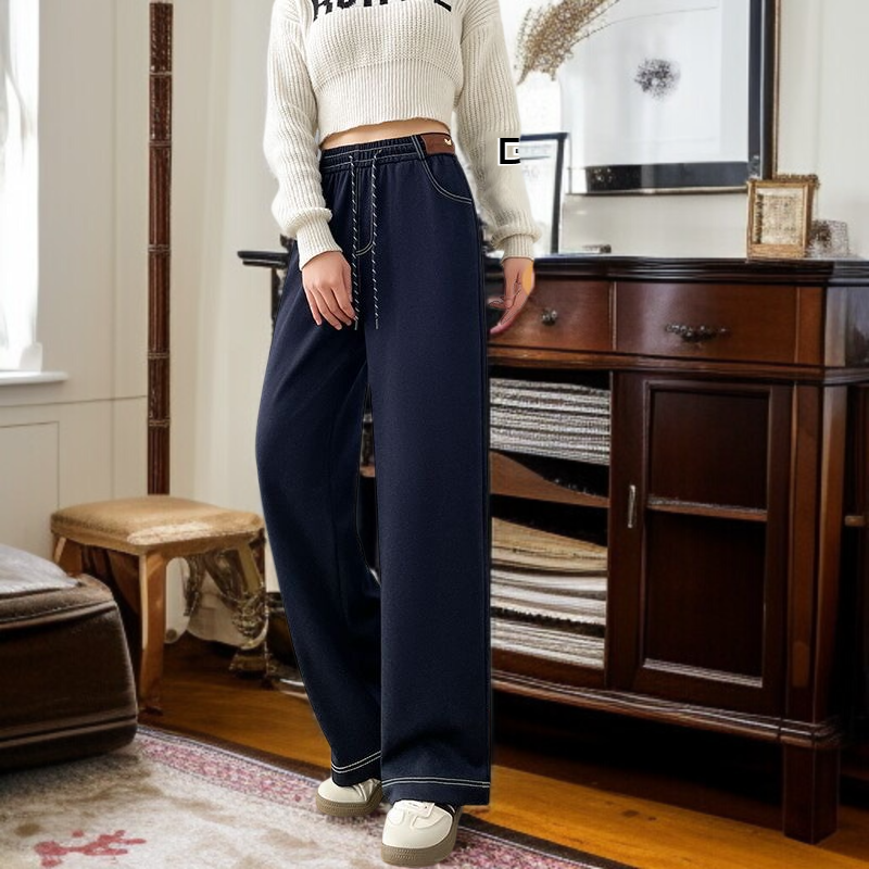 하이웨스트 와이드 팬츠 밴딩 일자 팬츠 빅 사이즈 여성 바지 기모 캐주얼 바지 청바지 여 하이웨스트 스판 빅 팬츠